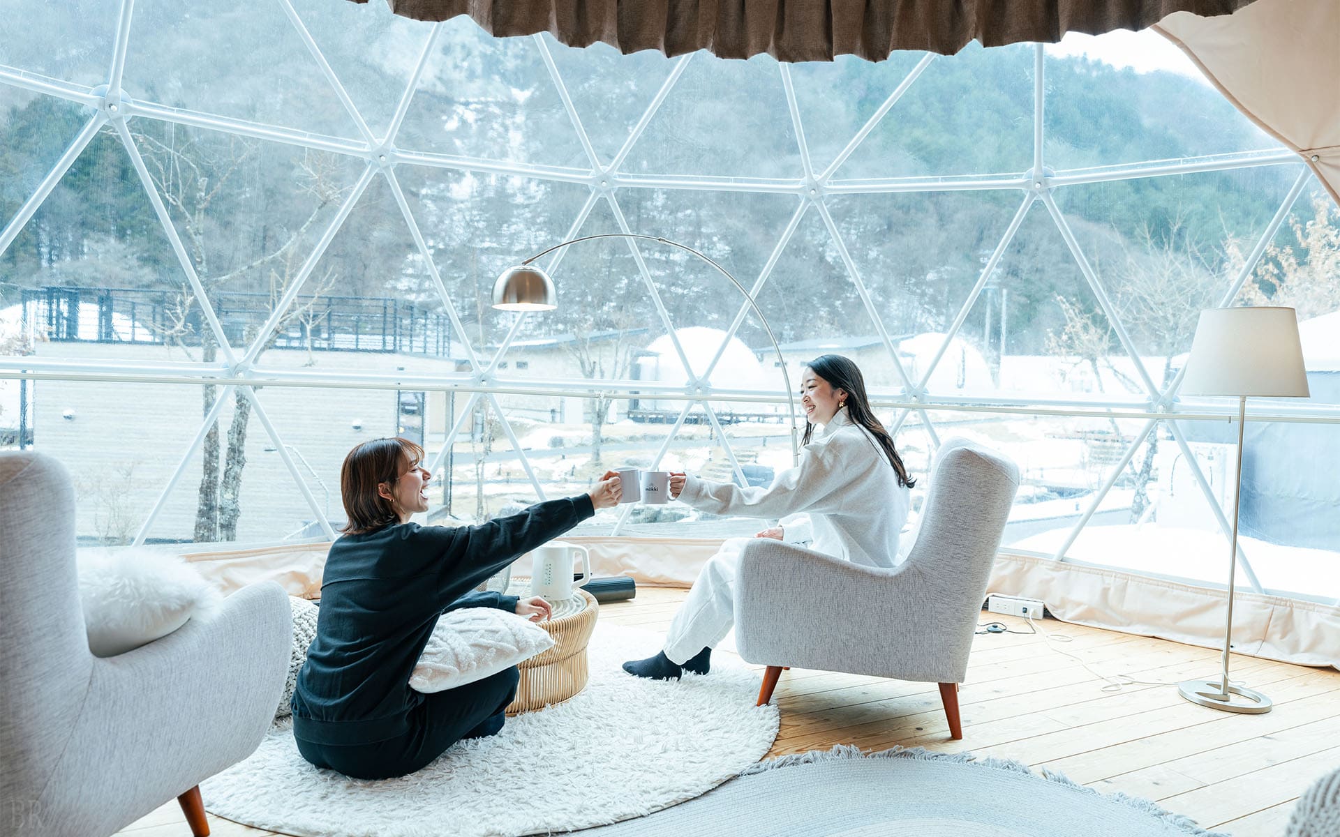 客房种类丰富,包括阿智村地区首个可住宿的大型穹顶帐篷、可携带爱犬入住的茧型帐篷,以及宽敞的双层豪华别墅。